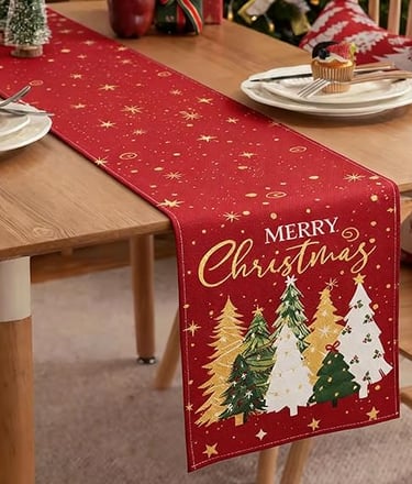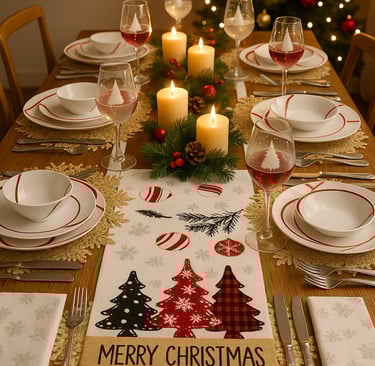 A bold red runner featuring festive Christmas trees and golden accents. Creates a warm, classic base for your Red Luxe tablescape and pairs beautifully with gold cutlery and candlelight.