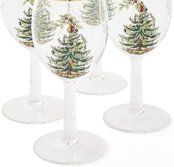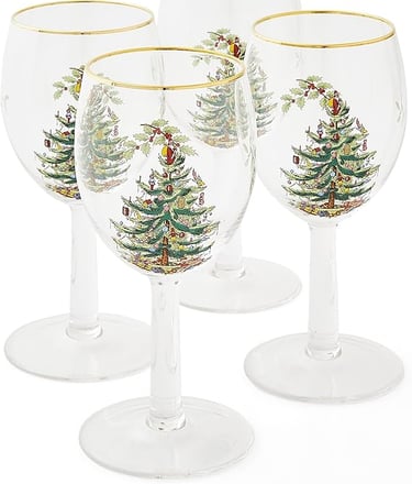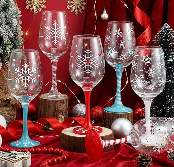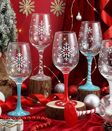 Charming festive wine glasses with festive detailing. Perfect for adding seasonal sparkle to your table and pairing beautifully with any Christmas tablescape.