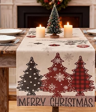 A festive white runner featuring charming patterned Christmas trees and soft winter tones. Perfect for adding a cosy, welcoming touch to your Christmas table and creating a beautiful base for candles.
