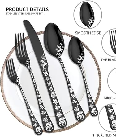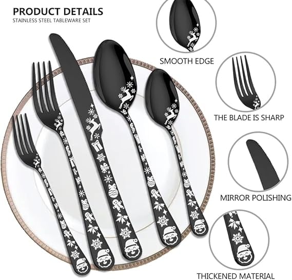 A striking black cutlery set detailed with silver snowflakes for a modern festive touch. Perfect for adding a bold winter sparkle to your Christmas table and pairing beautifully with white and gold décor.